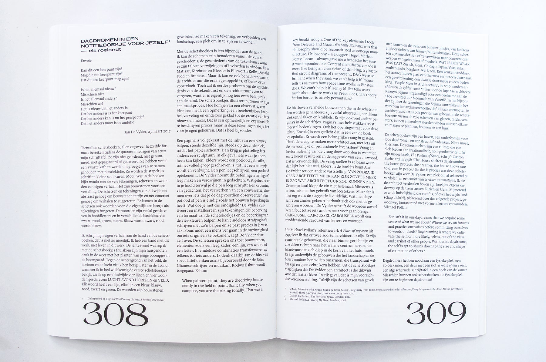 Posture Editions publishes a volume with a selection of 150 double page spreads from these sketchbooks, revealing the visual artist inside the architect Jan De Vylder. The sketches are somewhat similar to those made by other architects because of the speed with which they were made and the explanatory context that characterizes most sketches by architects (Aldo Rossi, Alvaro Siza, Juliaan Lampens, Le Corbusier…). However, the specific character of De Vylder’s drawings lies in the almost nonsensical repetition of the grammar of forms that seems to inspire him and after a while becomes autonomous and sovereign.