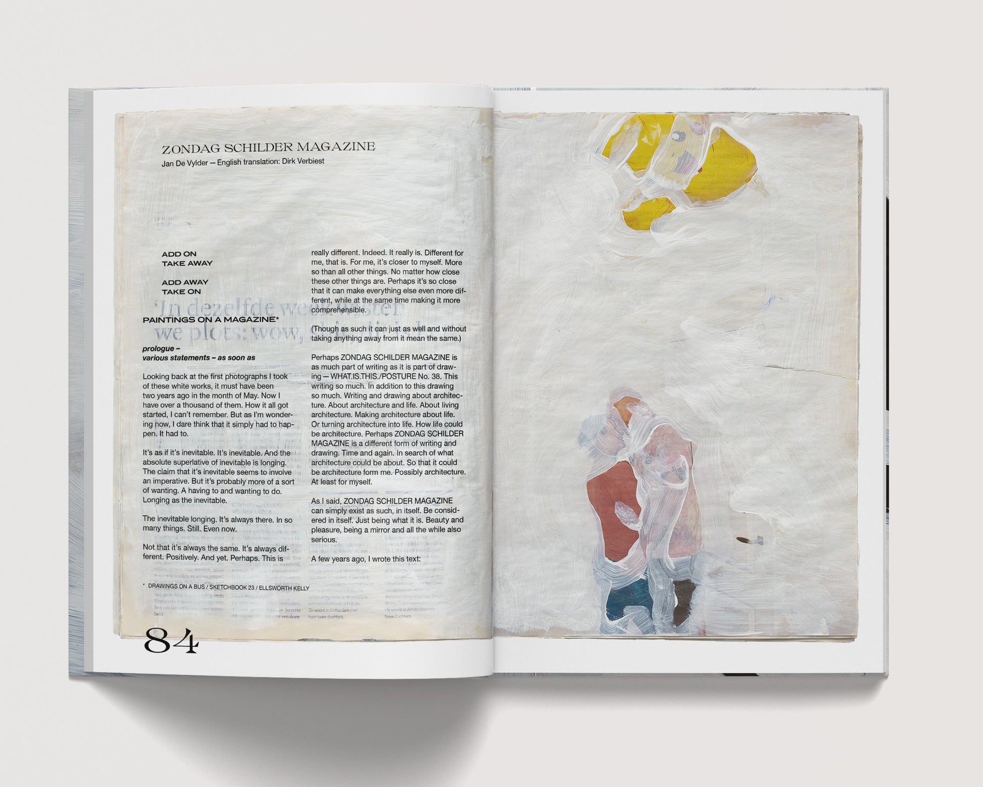 The publication ‘ZONDAG SCHILDER MAGAZINE’ also includes a text by De Vylder in which he relates the act of overpainting to the search for negative spaces, openings and fade-outs within his architectural practice and within his view of life.