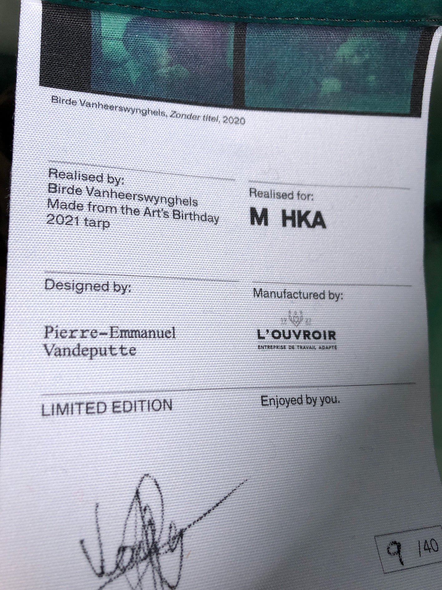 To celebrate the book 'A Glimpse Is All I Need' by Birde Vanheerswynghels, we offer this unique backpack, made on the occasion of the Art's Birthday from the work Untitled 2020 that was presented on the facade of M HKA in Antwerp in 2021.